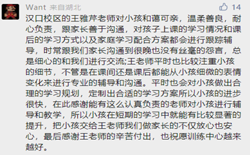 家長說,不管多晚王老師都會和他們交流孩子的情況;不管是課間還是課后,王老師總能通過孩子細微的表情變化來進行專業引導和溝通,把孩子交給王老師,不僅放心,更安心!