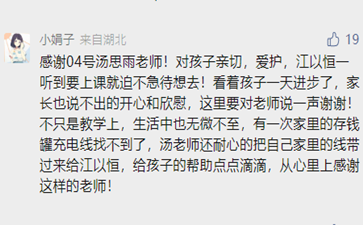 她在每一項訓練時臉上都保持著微笑,讓家長們隔著屏幕都能感受到孩子的歡聲笑語。教師的心應該充滿對每一個他要與之打交道的具體的孩子的愛,湯老師正是做到了差異化的愛與教學方式,才能得到這么多家長與孩子的喜歡。
