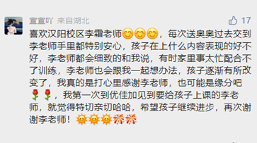 讓孩子能在開心的氛圍中提升能力,每次訓練都有收獲,孩子遇到問題和困擾的時候也第一時間愿意跟李老師分享,李霜老師付出的愛心,寶貝學的開心,讓家長托付的放心。
