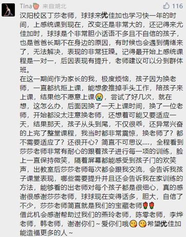 除了訓練上的用心,日常生活中也無微不至的幫助家長和孩子,用真心換真心,小朋友們都是迫不及待要上湯老師的課,家長們都從心底里感謝這樣的老師!