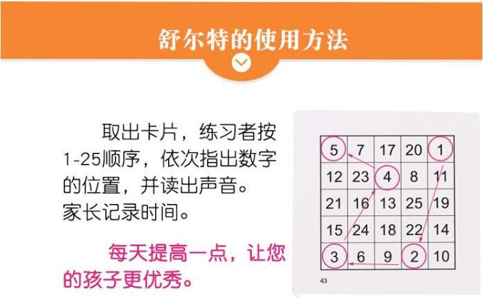 2、舒特爾圖:學生快速轉動眼球,按照順序把數字從1-25找出來,這可以鍛煉學生眼球的追隨運動,提高視覺廣度,從而提升閱讀速度。